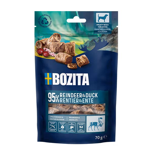 Bozita Meaty Bites Ren & Anka är inspirerat av nordisk natur och rundat med lingon och ljung för en mild, aromatisk smakprofil. Passar hundar i alla raser och åldrar.