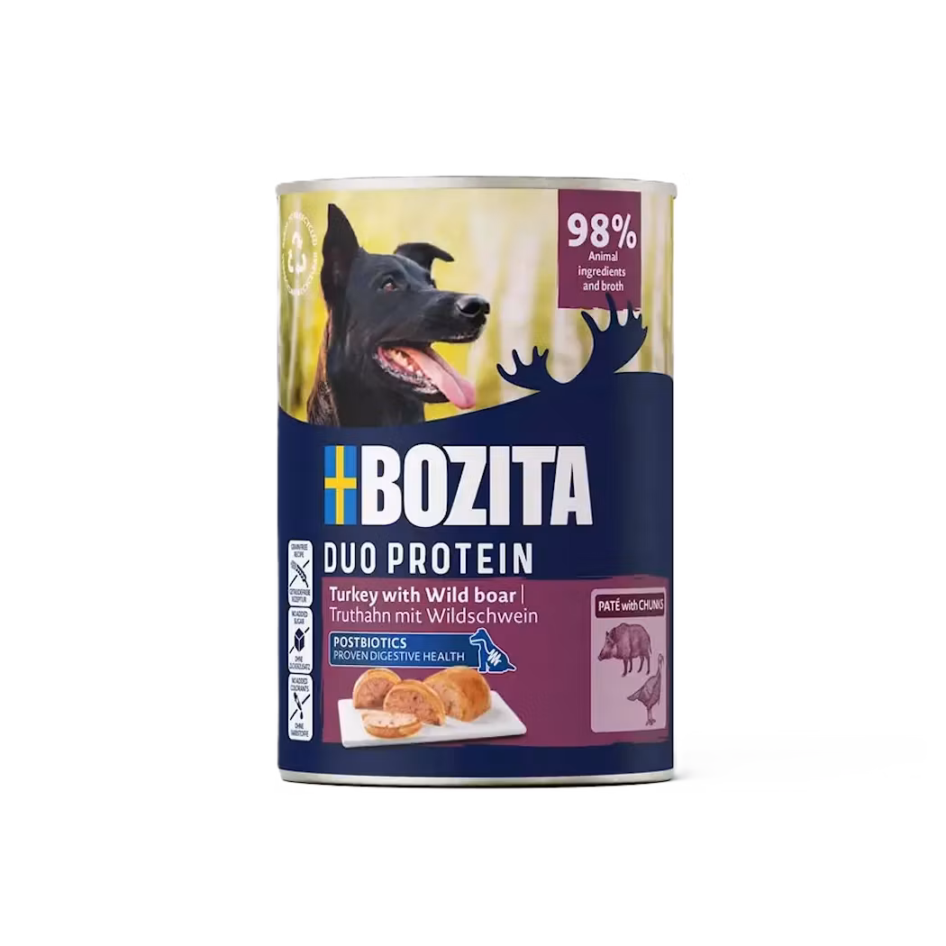 Bozita Dog Paté Turkey & Wild Boar är ett helfoder i klassisk patéform,tillagat med två animaliska proteinkällor. Det gör innehållet lätt att förstå, enkelt att smälta – och extra tryggt för hundar med känslig mage. Bozita Dog Paté innehåller noga utvalda råvaror med hög andel kött, utan spannmål, utan tillsatt socker eller färgämnen.