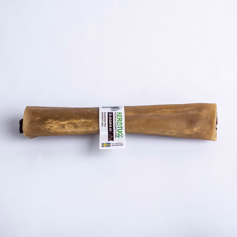 Tuggrulle av torkad råhud från Älg med en fyllning av torkat grishjärta.